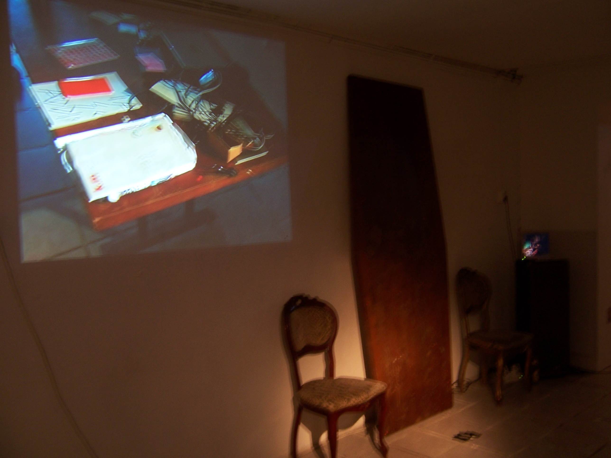 Our four full days at Andergrond we used to produce the DVD 'ATCVideo #1'. During the whole time the space was open to visitors at the times announced on the flyer. The work situaton was part of the ongoing installation. The presentation of the DVD on the fourth night at 'Andergrond' included a live performance in the especially altered installation/room situation. The DVD was also shown on the last night of the festival at the finishing party. |