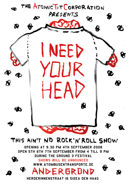 | We realized the project 'I NEED YOUR HEAD- this ain't no rock'n'roll show' in September 2008 during the 'Festival Ground3- Art not for sale?!' on invitation to the artspace 'Anderground' at The Hague. We experimented with terms like - everyday violence - zombiism as strategy against the need for constant innovation - madness or fame - religious practises and faith / performance on stage - applause as music - teen energy vs. no age We had the opportunity to use the exhibition space for four full days. website Andergrond website Festival Ground3 |