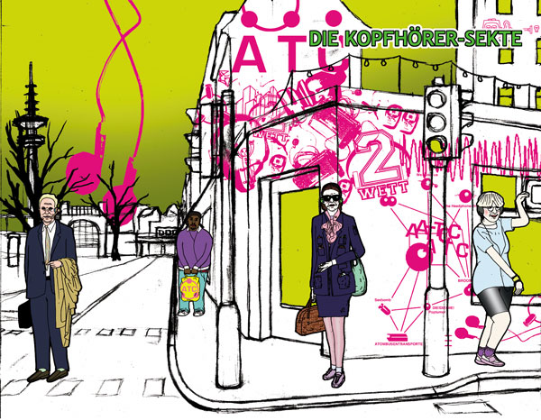 "DIE KOPFHÖRER-SEKTE" von Jadwiga Stummann AtomicTitCorporation / HfBK Hamburg, Medienoekologie 2004 Theory and fiction about the use of headphones and their connection to personal portable stereos and mobile phones, to (street)-art, music, desynchronisation, confusion, desire, communication,subversion and affirmation.
